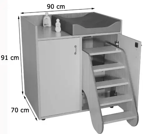 Mueble cambiador con 2 puertas, con balda en el interior de una de las puertas y escalera giratoria (en el interior de la otra), que voltea facilmente, gracias al sistema de giro incorporado, al tirar de ella y vuelve a introducirse cuando se levanta, quedando oculta en el interior del cambiador. Fabricado en melamina de haya de 19 mm de grosor, trasera de 10 mm, puertas en 16 mm y cantos de PVC de 2 mm, acabado por las dos caras. Pies niveladores de 4 cm de diámetro y 4 cm de altura para evitar la humedad y los desniveles que pueda tener el suelo.